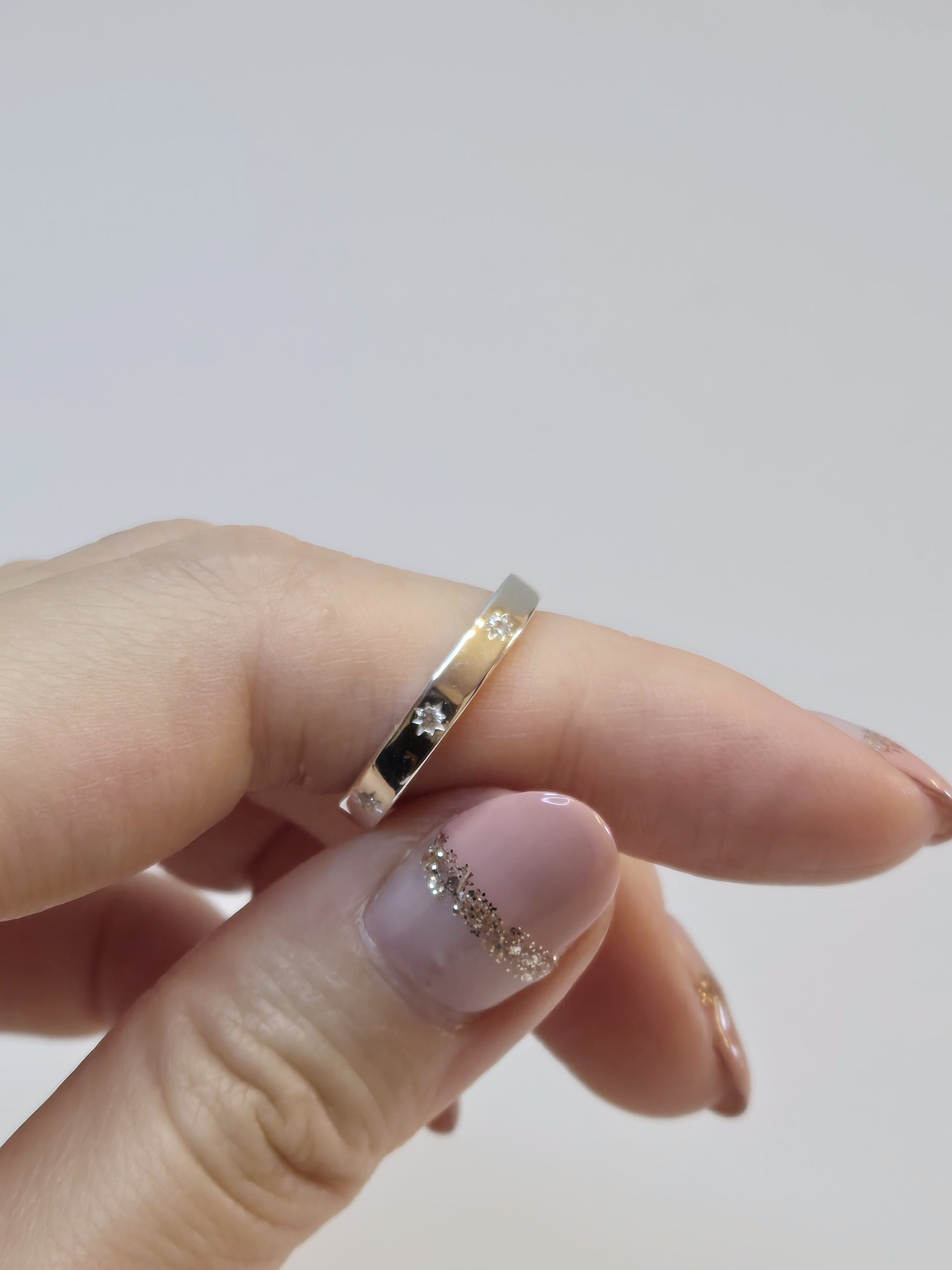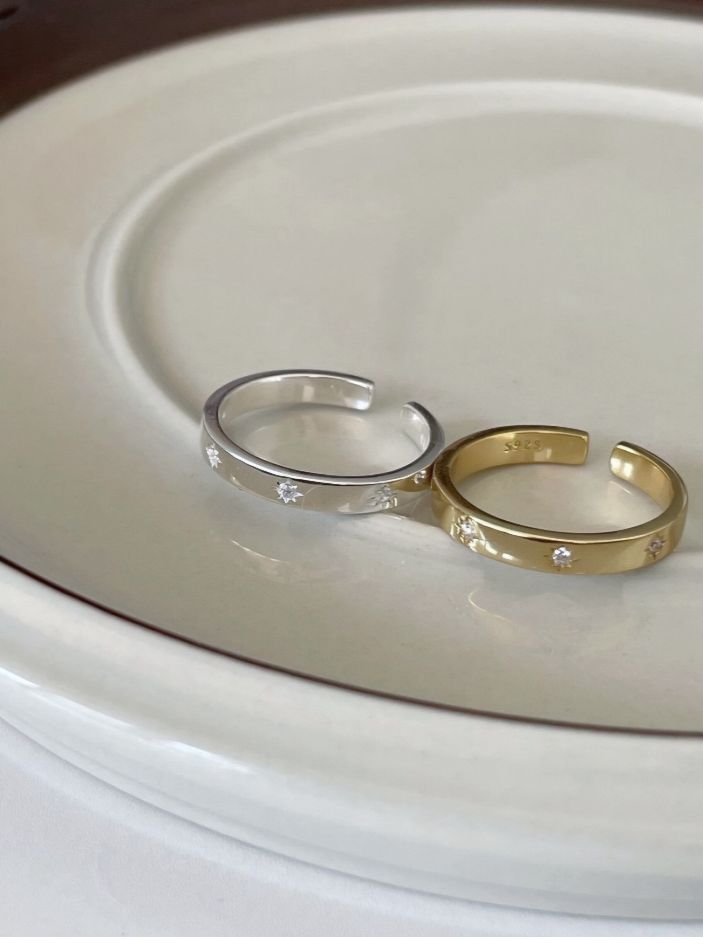 控えめながらも華やかさを感じさせるシンプルなビジューリング。美しい輝きを放つストーンが、指先に上品なアクセントを加えます。デイリーコーデから特別なシーンまで、どんなスタイルにもマッチする万能アイテムです。
